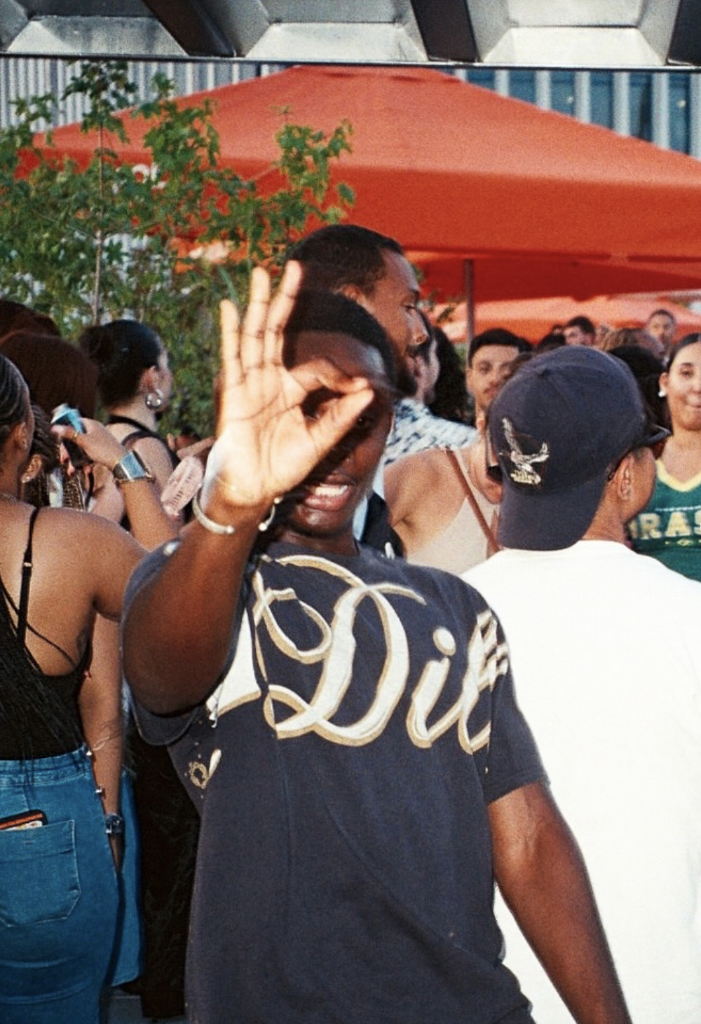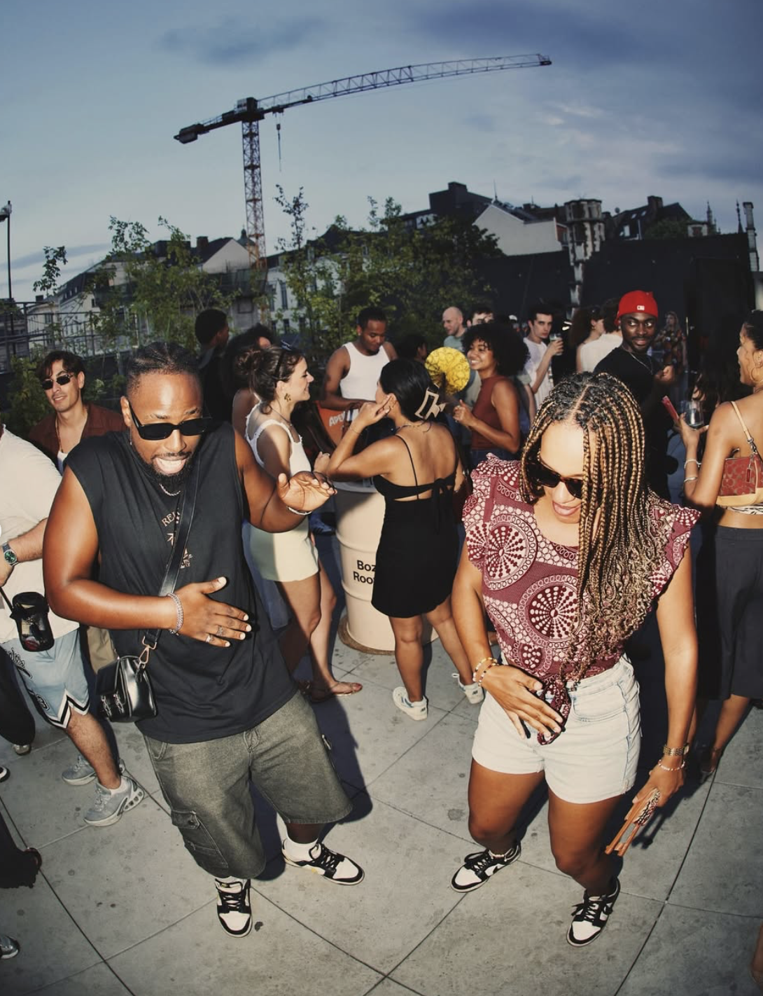 Enfin, en traversant un dernier rideau végétal, on débouche sur la clairière. C’est là, au cœur de la plus grande largeur du rooftop, que s’ouvre un dancefloor circulaire, posé sur un disque bleu en plastique recyclé. Tout autour, les arbres dessinent un cercle, comme une scène naturelle. On y danse entre ciel et sol, suspendu·es entre deux disques bleus – l’un terrestre, l’autre céleste.